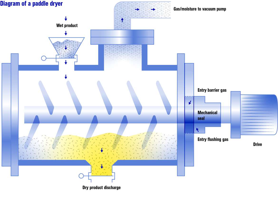In horizontal paddle dryers such as those used at Merck, the seals are also usually to be found in the product. It is therefore necessary to reliably prevent contamination from the barrier medium used as well as abrasion from the sliding faces. A further requirement for the sealing system was compliance with Directive 94/9/EC (ATEX 95) or 2014/34/EU, which regulates the commissioning of machines in potentially explosive atmospheres.